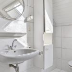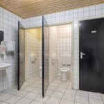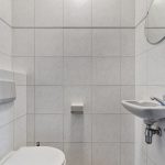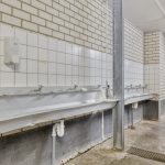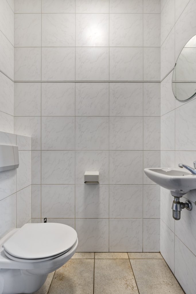 Sanitair: Geheel betegeld, bestaande uit een toiletgroep met 3 toiletten, wastafel en kastruimte en een toiletgroep met 4 toiletten, wastafel en kastruimte. RVS wastafels aanwezig in centrale gang.