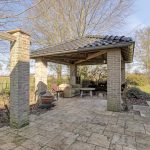 De ruime tuin beschikt over een fraai betegeld terras met pergola, een sfeervolle overkapping, gazon en gevarieerde beplanting.
