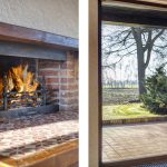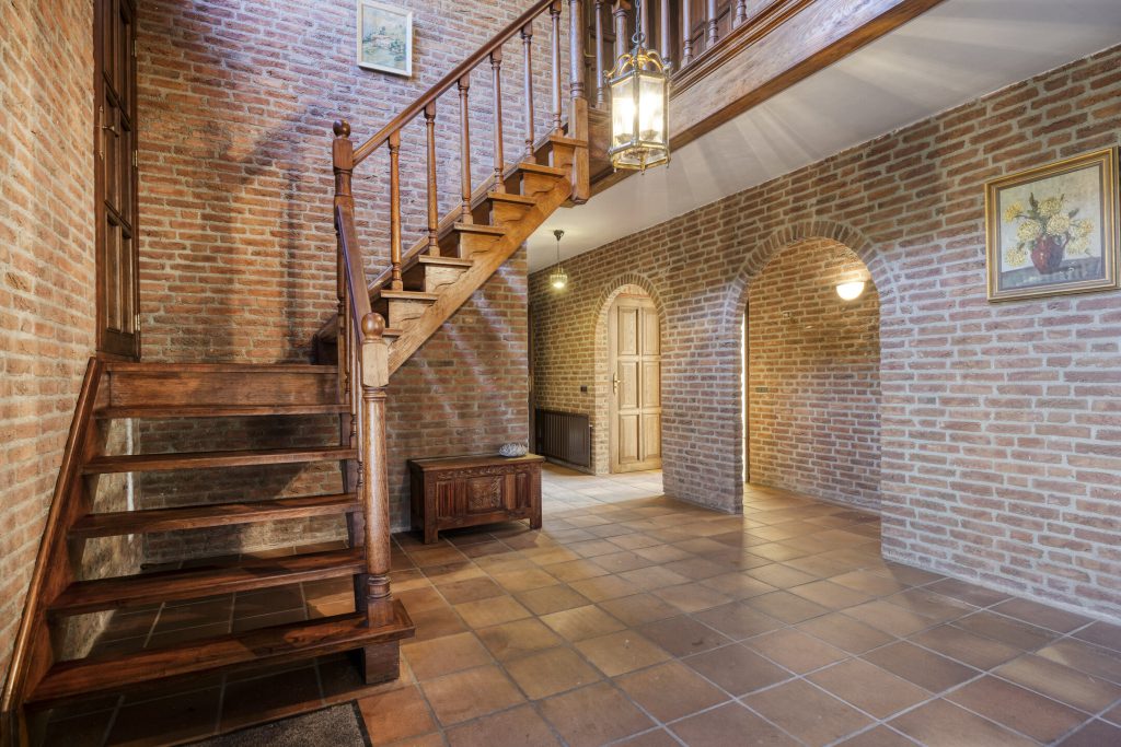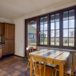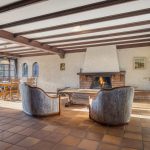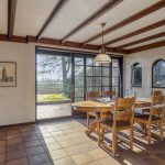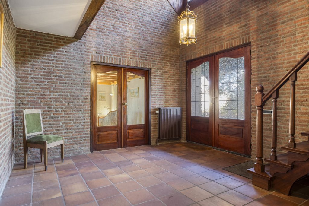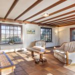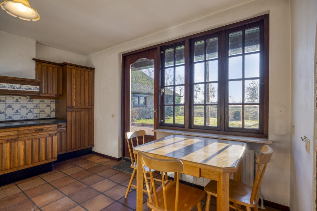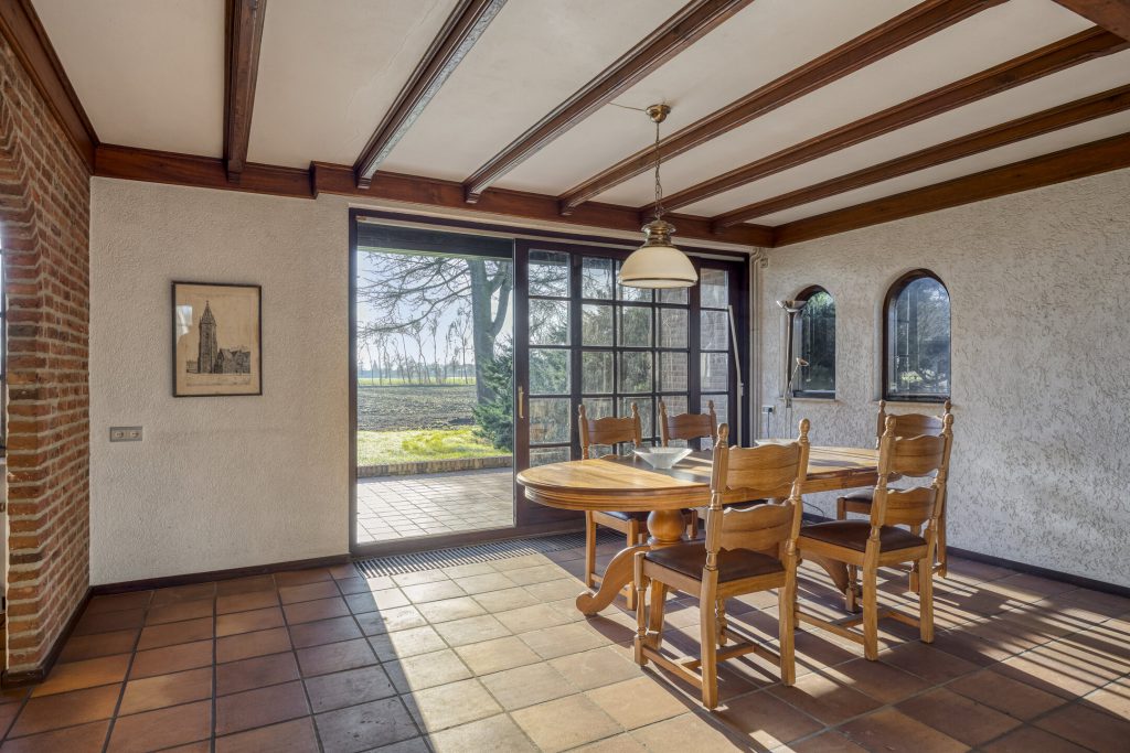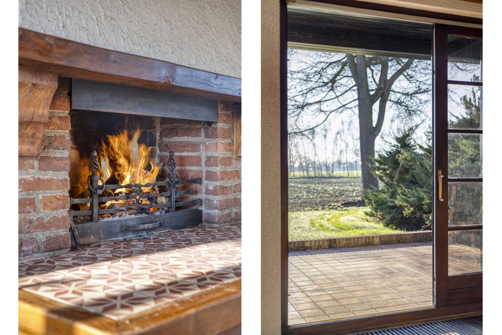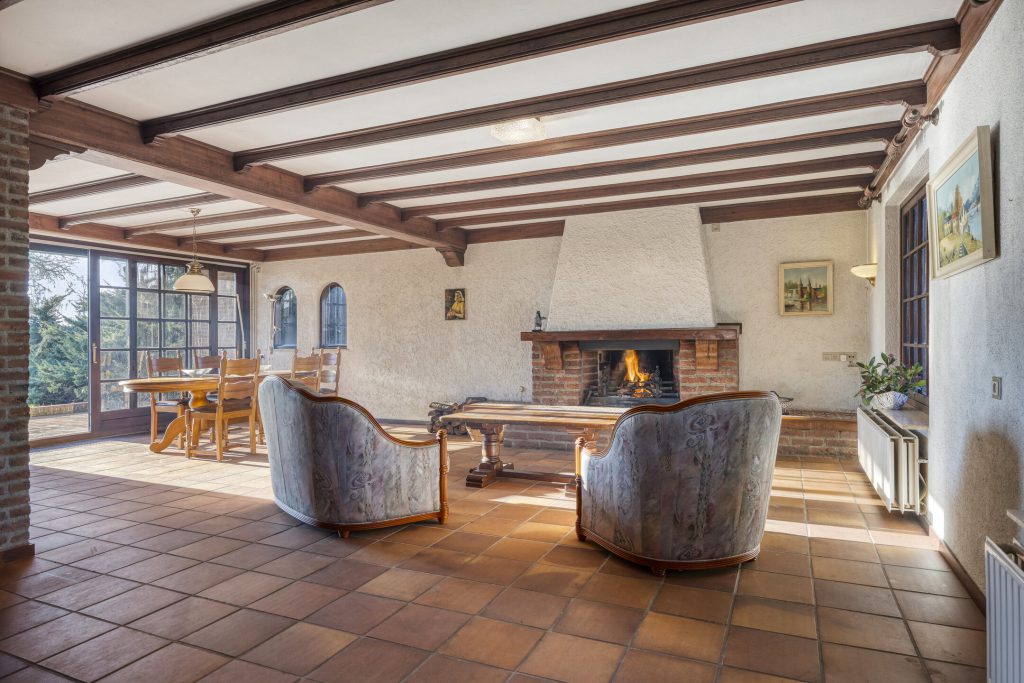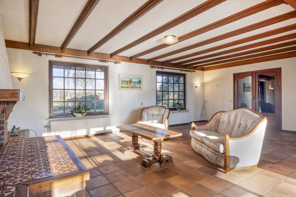 De woonkamer heeft een klassieke, landelijke uitstraling met sfeervolle open haard, balkenplafond en terracotta vloer. Grote raampartijen met roedeverdeling bieden veel natuurlijke lichtinval en een mooi uitzicht op de tuin en de landerijen.