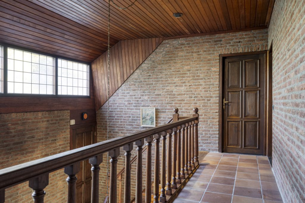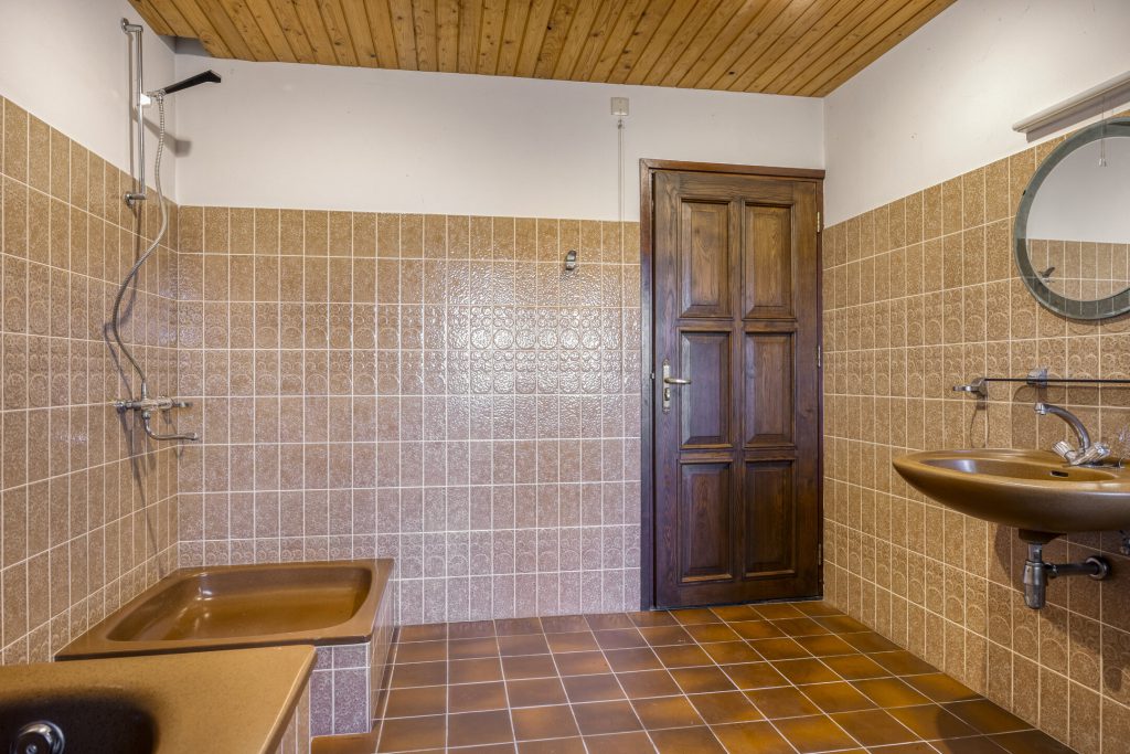 De volledig betegelde badkamer is uitgerust met een douche, toilet en wastafel. In de berging bevindt zich een luik met toegang tot de bergzolder. De slaapkamer aan het einde van de gang is ruim van formaat en heeft een deur naar het balkon aan de achterzijde, waar je volop kunt genieten van het vrije uitzicht over de landerijen.