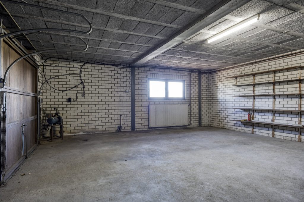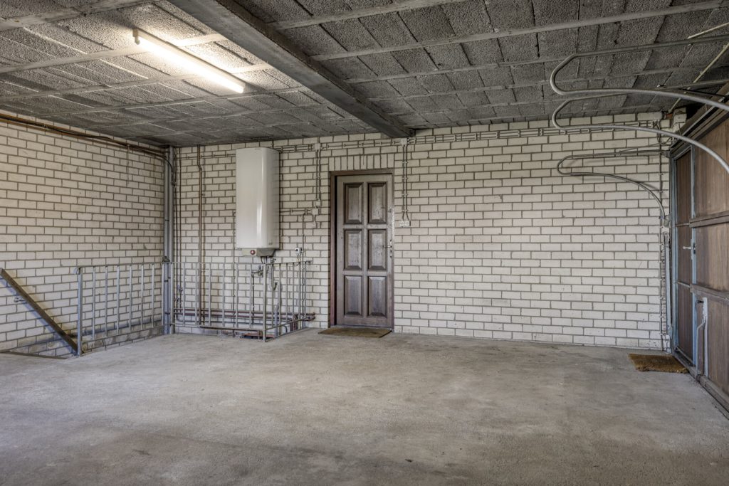 De woning beschikt over een grote inpandige garage met twee garagedeuren, waarvan één met praktische loopdeur. Hier is de elektrische huurboiler geplaatst en heb je toegang tot de ruime kelder met meerdere vertrekken en toegang tot de kruipruimte.