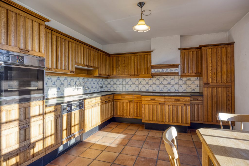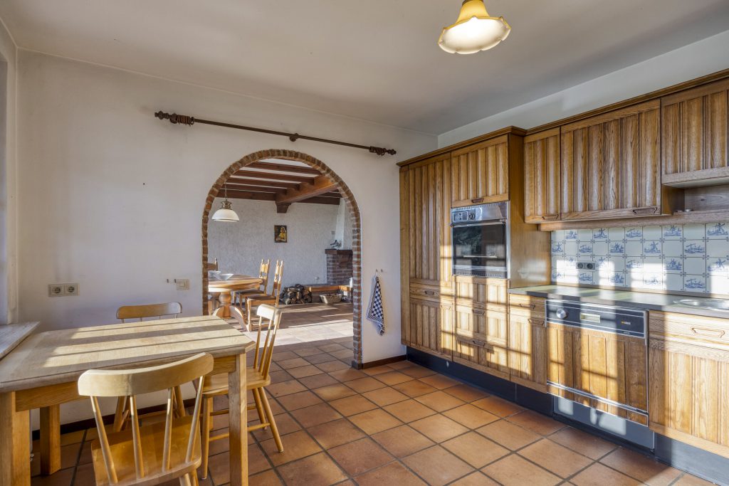 De keuken met kunststof blad en Oudhollandse tegeltjes is uitgerust met een elektrische kookplaat en afzuigkap. De inrichting is nog geheel origineel en deels gedateerd, maar biedt volop kansen om hier een moderne droomkeuken naar eigen smaak te creëren. Via de achterdeur in de keuken is er direct toegang tot de tuin en het terras.