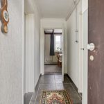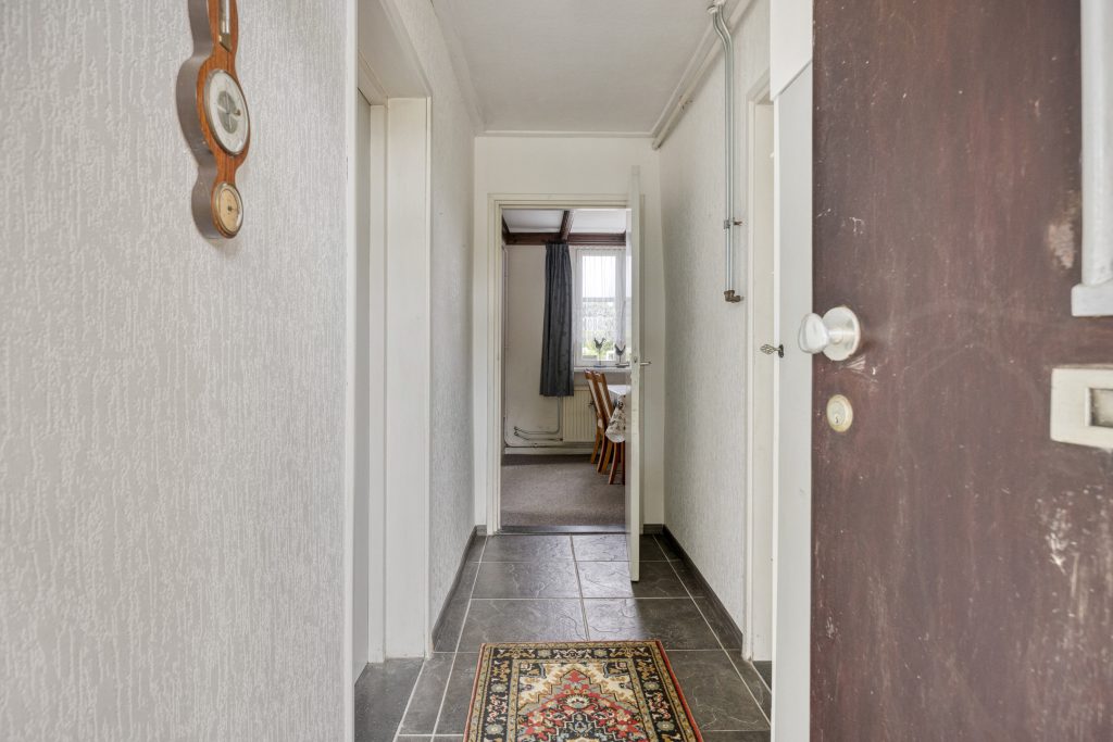 De entree van de woning is afgewerkt met een tegelvloer en behangwanden. In de entree is de meterkast gesitueerd. Vanuit hier is er toegang tot twee (slaap)kamers en de eetkamer met woonkamer. De twee kamers bevinden zich aan de straatzijde van de woning en zijn afgewerkt met behangwanden. De kamers zijn voorzien van een betonvloer, de rechterkamer is afgewerkt met een tapijt vloerbedekking. De kozijnen bestaan uit hout voorzien van enkelglas.