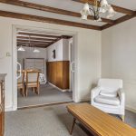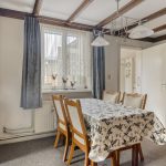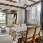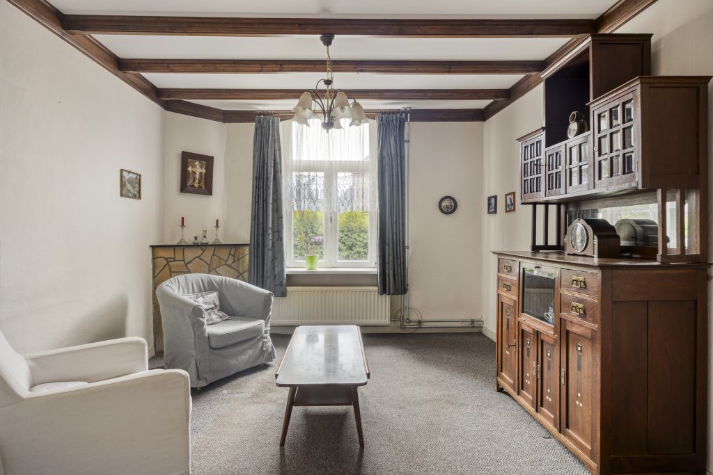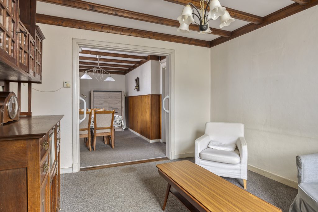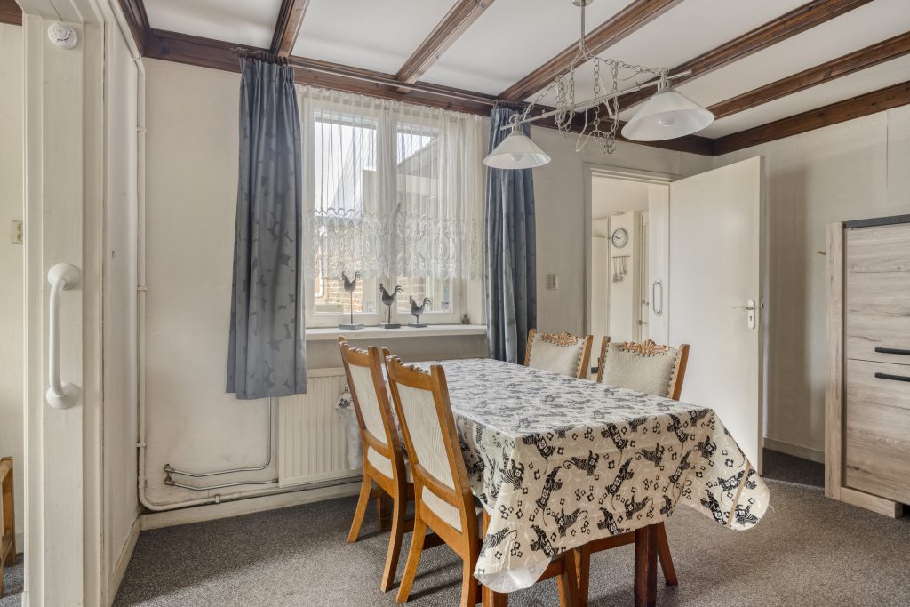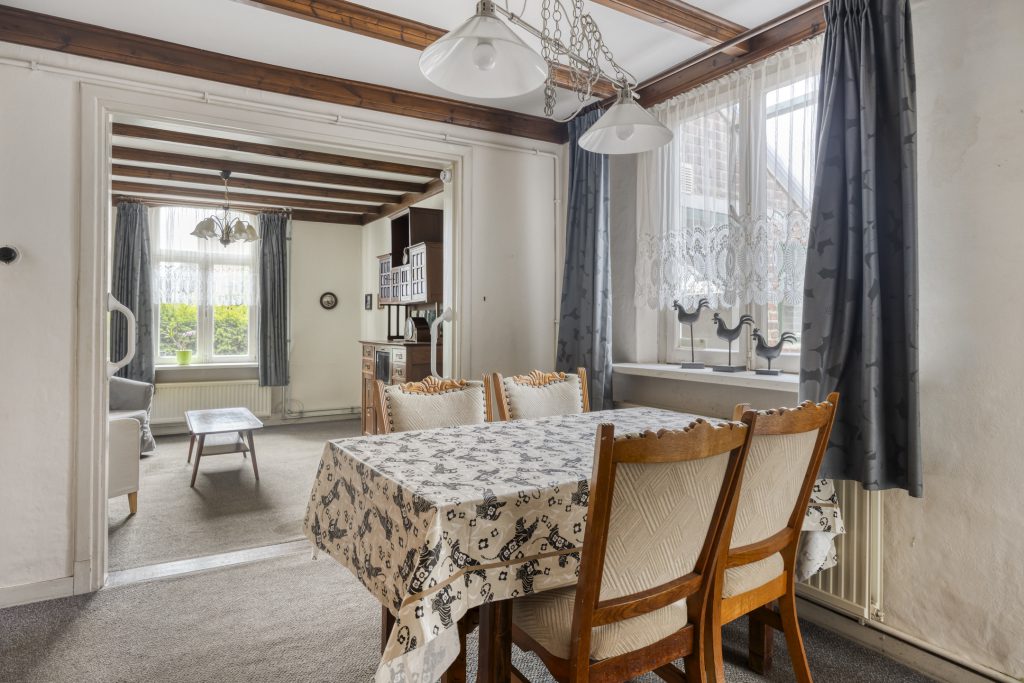 De eet- en woonkamer is van oorsprong van elkaar gescheiden, waar voorheen ensuite deuren zaten. Deze deuren zijn reeds verwijdert en zorgt voor een open en ruimtelijk geheel. De ruimtes kenmerken zich door een aangename lichtinval dankzij de grote raampartijen en zijn afgewerkt met klassieke details, waaronder houten plafondbalken en een karakteristieke schouw met gashaard. De vloer bestaat uit een vloerbedekking en de wanden zijn afgewerkt met behang en deels houten lambrisering.
