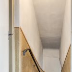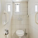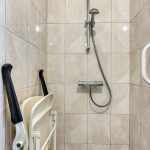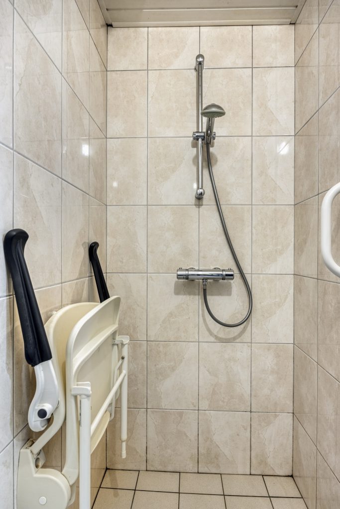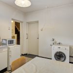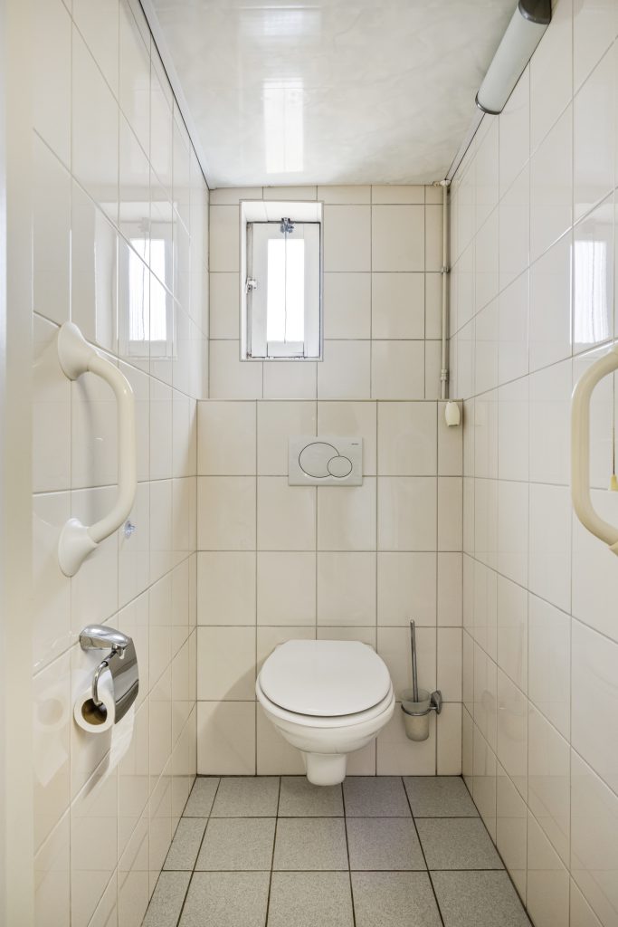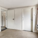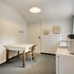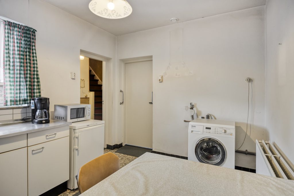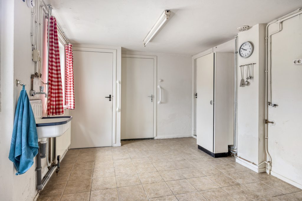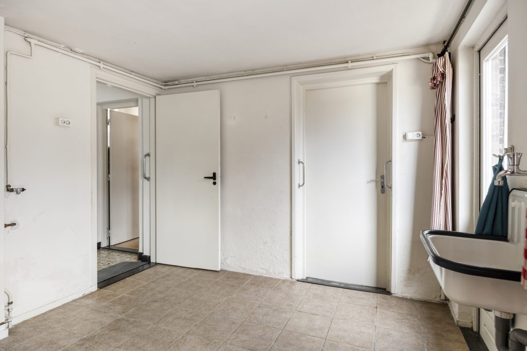 De ruime bijkeuken met tegelvloer geeft toegang tot het geheel betegelde toilet met zwevend closet en een separate douche. Daarnaast is vanuit de bijkeuken, de garage en keuken toegankelijk, tevens wordt de bijkeuken als achterom gebruikt.