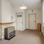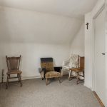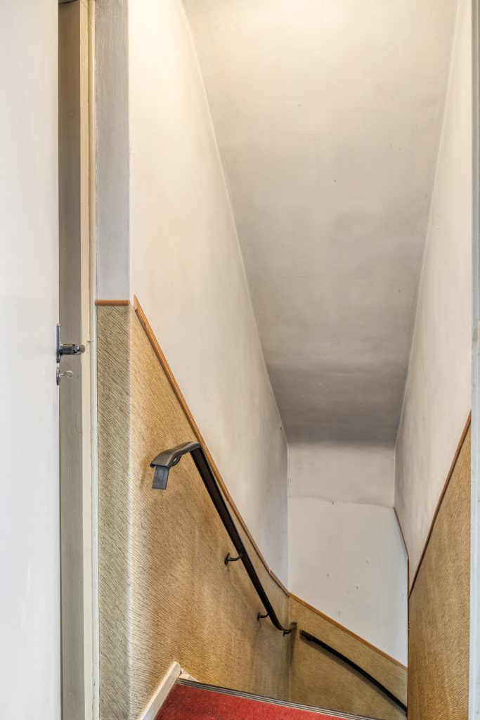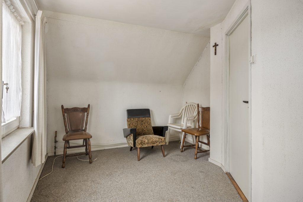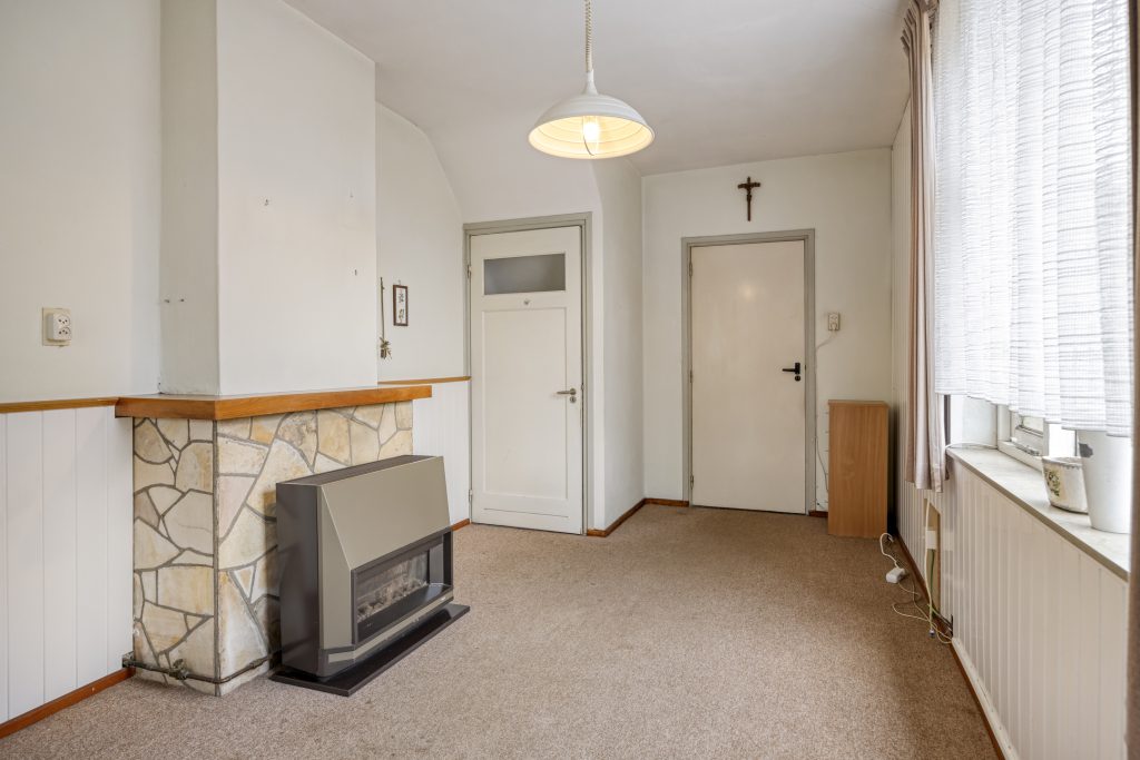 Vanuit de keuken is een hal met trapopgang naar de verdieping toegankelijk en een tweede woon-/ zitkamer. Deze lichte kamer is afgewerkt met kunststoflambrisering met behangwanden en heeft een tapijt vloerbedekking. De klassieke schouw met gaskachel voegt warmte toe aan deze ruimte. De ramen bestaan uit houten kozijnen met enkelglas. Onder de trap is een praktische muurkast aanwezig.