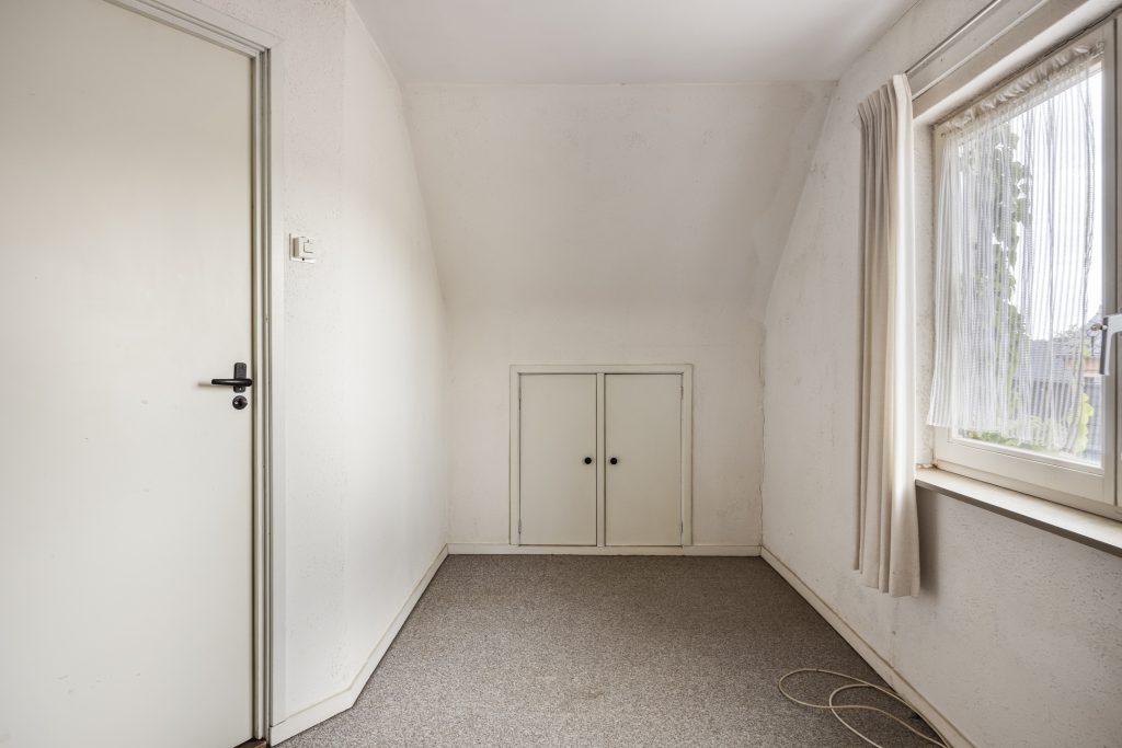 De verdieping van de woning is ingericht met twee slaapkamers en een zolder. De slaapkamer aan de voorzijde van de woning is afgewerkt met tapijt vloerbedekking en beschikt over een grote raampartij met houten kozijnen en dubbelglas. De kamer heeft een praktische muurkast onder het knieschot van het dak. De tweede slaapkamer heeft een dakraam en een houten vloer. Vanuit hier is de zolderkamer toegankelijk met twee houten kozijnen voorzien van draaikiepramen met dubbelglas. De zolder heeft een houtenvloer.